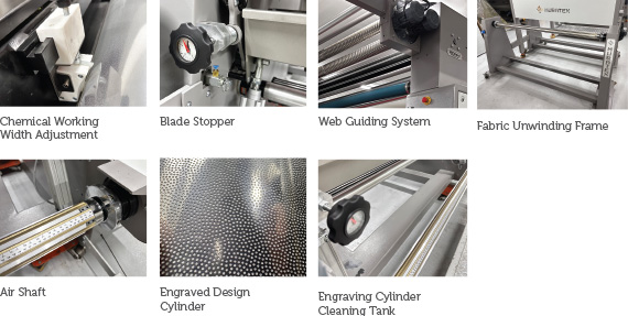 This machine has the capability to perform thermo-adhesive hotmelt and reactive polyurethane lamination on various materials such as fabric, jersey, elastic fabric, film, breathable membranes, foams, and abrasive sponges. Additionally, different engraved lamination rollers can be provided for this machine.